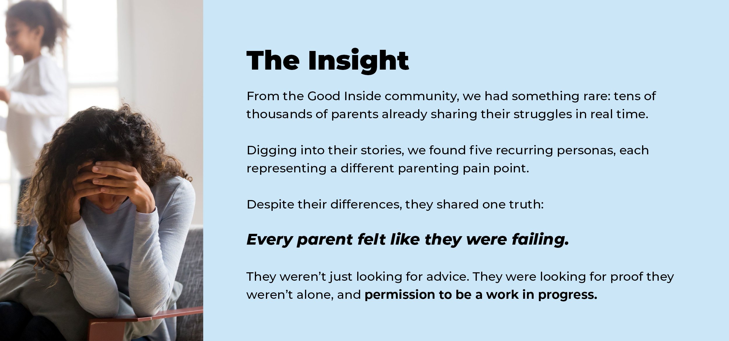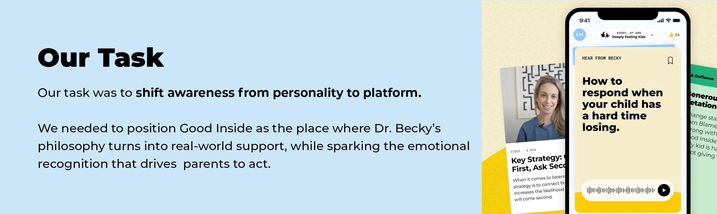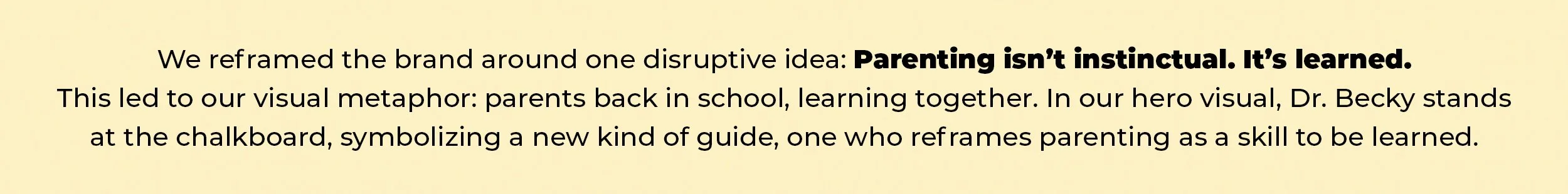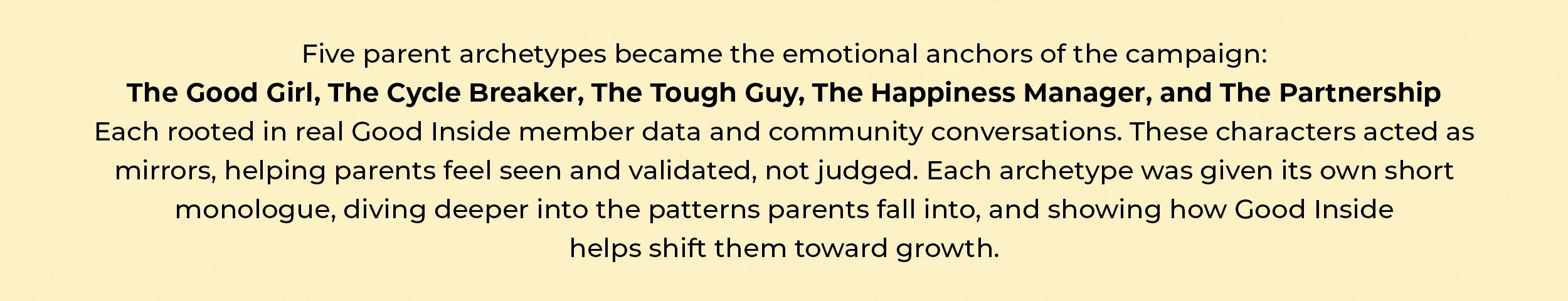 Parenting is the hardest job in the world, and yet, it comes with no training manual. We’re taught how to drive, how to cook, how to tie our shoes, but when it comes to raising kids, most of us are told to “just figure it out.” That insight inspired Good Inside’s first-ever 360° brand awareness campaign: positioning the parenting platform as a modern classroom for parents, and founder, Dr. Becky Kennedy as a trusted guide. Grounded in real community conversations, the campaign introduces five parent archetypes: The Good Girl, The Cycle Breaker, The Tough Guy, The Happiness Manager, and The Partnership, each reflecting universal modern parenting challenges and their moments of growth. At the center, Dr. Becky stands at the chalkboard reminding parents that instincts aren’t enough; skills can be learned. We positioned Good Inside as a category leader, shifting the dialogue from parenting tactics to parent support. The campaign gave parents something they had long been missing: permission to learn. Because when we know better, we parent better.